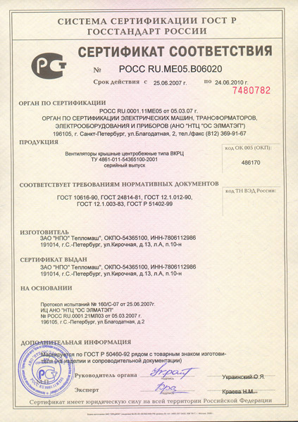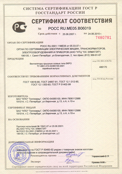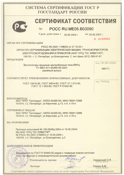 Cертификат соответствия вентиляторы крышные осевые типа ВКРО