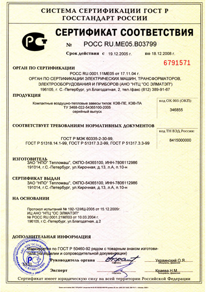 Сертификат соответствия Компактные воздушно-тепловые завесы типов: КЭВ-ПЕ, КЭВ-ПА.