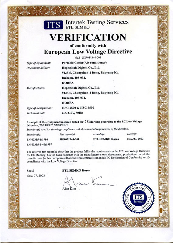 Европейский сертификат качества на мобильные кондиционеры Airrex