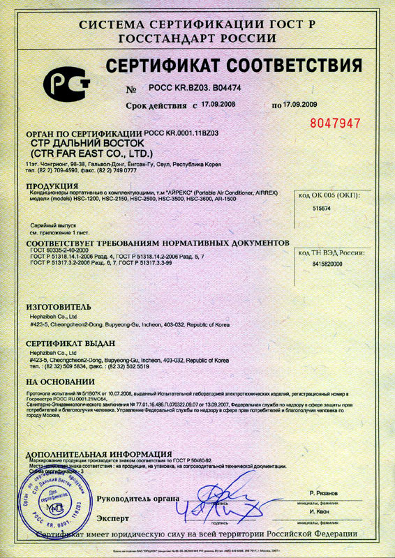 Сертификат соответствия Госстандарта РФ на мобильные кондиционеры Airrex