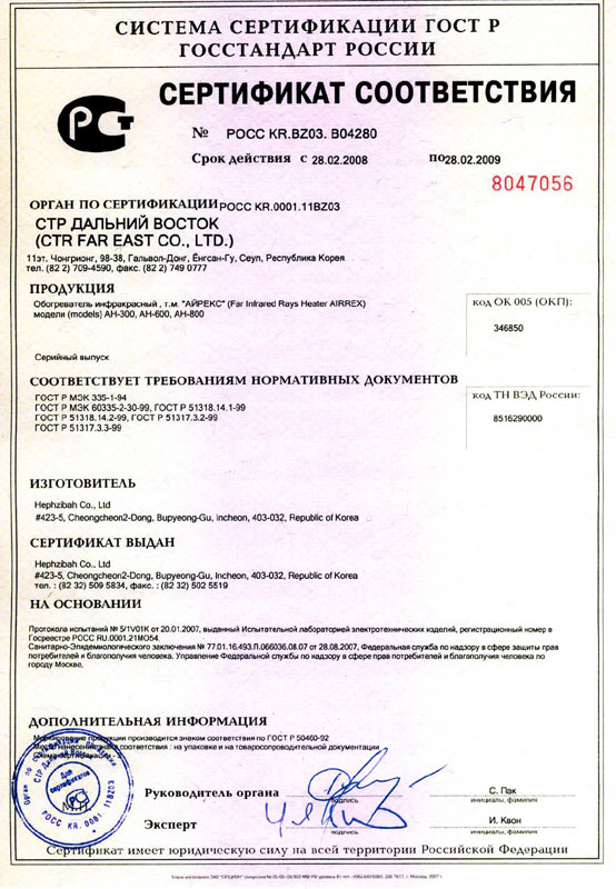 Сертификат соответствия Госстандарта РФ на инфракрасные обогреватели Airrex