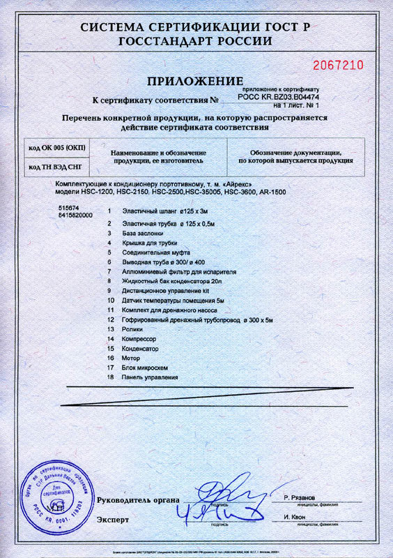 Сертификат соответствия Госстандарта РФ на мобильные кондиционеры Airrex, приложение