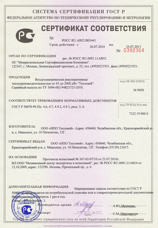 Сертификат соответствия госстандарта на воздухонагреватели рекуперативные «Тепловей»