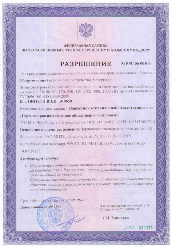 Разрешение гостехнадзора на применение воздухонагревателей «Тепловей» на опасных производственных объектах