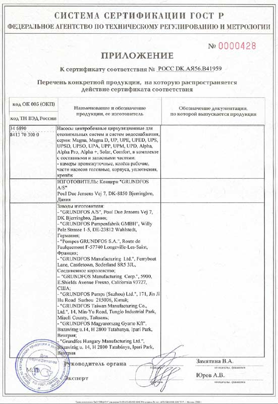 Сертификат соответствия на продукцию Grundfos (стр.2)