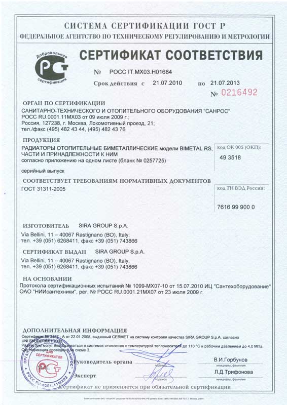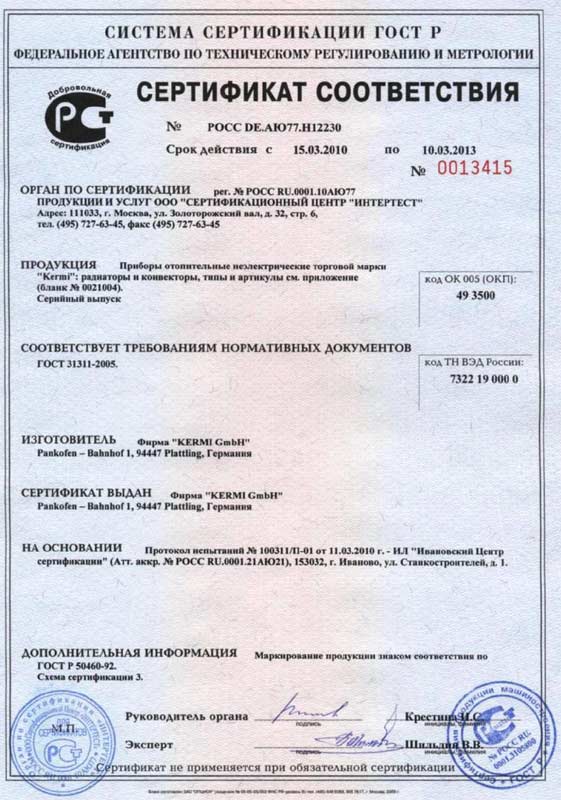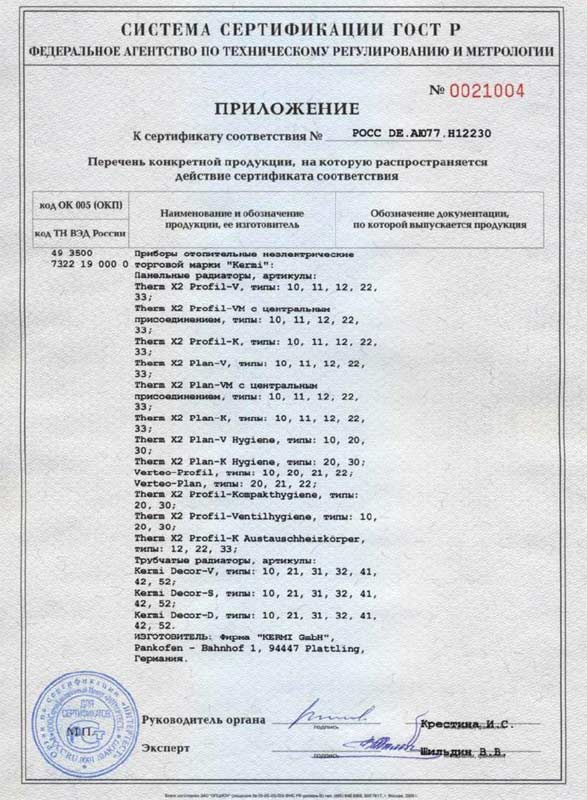 Приложение к сертификату соответствия на продукцию Kermi (стр.1)