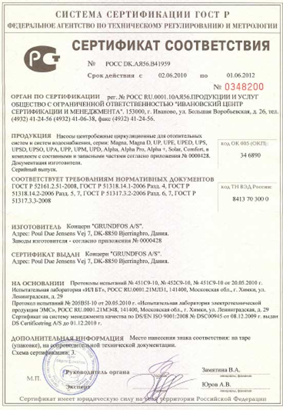 Сертификат соответствия на продукцию Grundfos (стр.1)