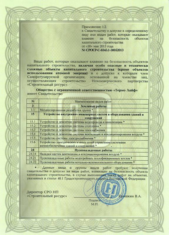 Допуск СРО к строительным работам, оказывающим влияние на безопасность объектов капитального строительства. Приложение 1.2