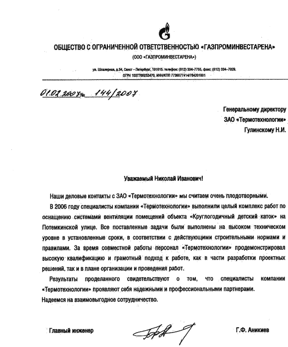 Наши деловые контакты с ЗАО «Термотехнологии» мы считаем очень плодотворными.