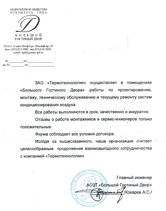 ЗАО «Термотехнологии» осуществляет в помещениях «Большого Гостиного Двора» работы по проектированию, монтажу, техническому обслуживанию и текущему ремонту систем кондиционирования воздуха.