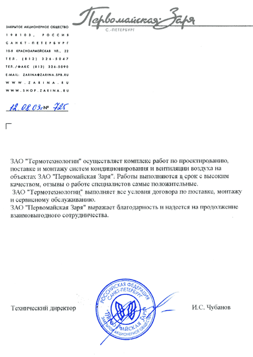 ЗАО "Термотехнологии" осуществляет комплекс работ по проектированию, поставке и монтажу систем кондиционирования и вентиляции воздуха на объектах ЗАО "Первомайская Заря". Работы выполняются в срок с высоким качеством, отзывы о работе специалистов самые положительные.