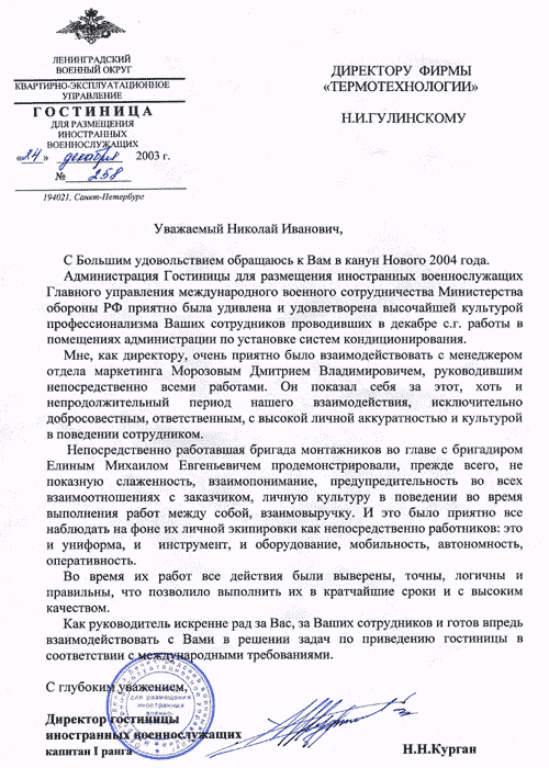 Администрация Гостиницы для размещения иностранных военнослужащих Главного управления международного военного сотрудничества Министерства обороны РФ приятно была удивлена и удовлетворена высочайшей культурой профессионализма Ваших сотрудников проводивших в декабре с.г. работы в помещениях администрации по установке систем кондиционирования.