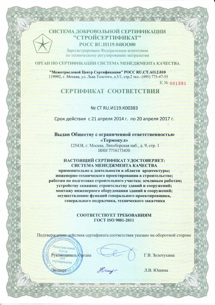 Компания получила сертификат ГОСТ ISO 9001-2011Компания «ТЕРМОКУЛ» успешно прошла аудит на соответствие требованиям системы менеджмента качества ГОСТ ISO 9001-2011.