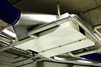 На объекте применены двухблочные потолочные воздухоохладители, каждый с двумя радиальными ЕС-вентиляторами, захватывающими воздух сверху и выдувающими его горизонтально в обе стороны в текстильные рукава, с поддоном, имеющим 20-миллиметровую изоляцию. Блок и поддон оттаиваются гликолем. Необходимая холодопроизводительность поддерживается регулированием частоты вращения электродвигателей вентиляторов по сигналу датчика температуры.