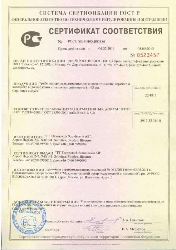 Сертификат соответствия на трубы напорные из полиэтилена PE-RT