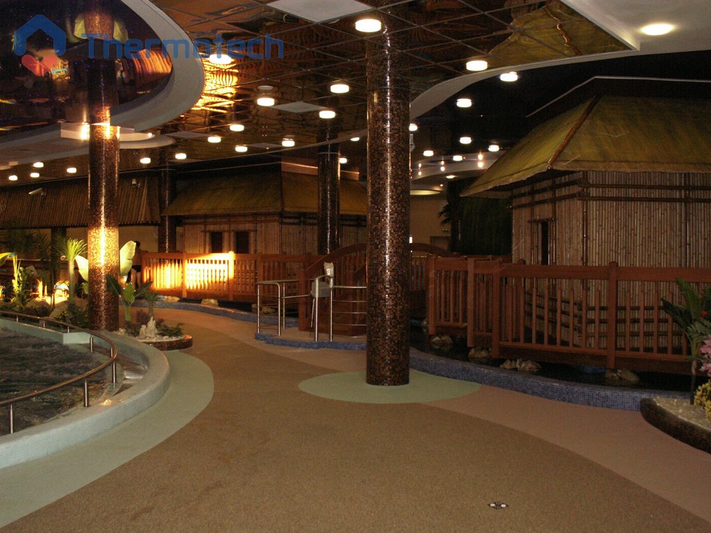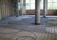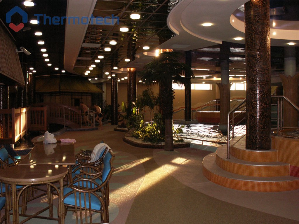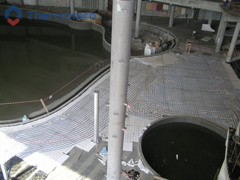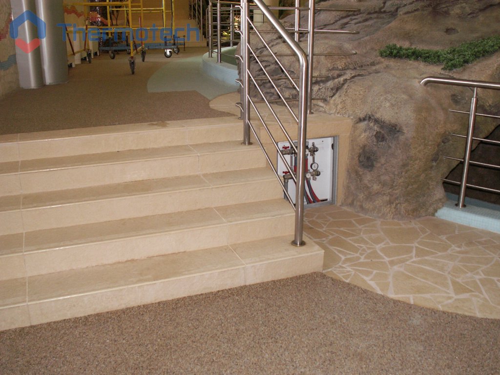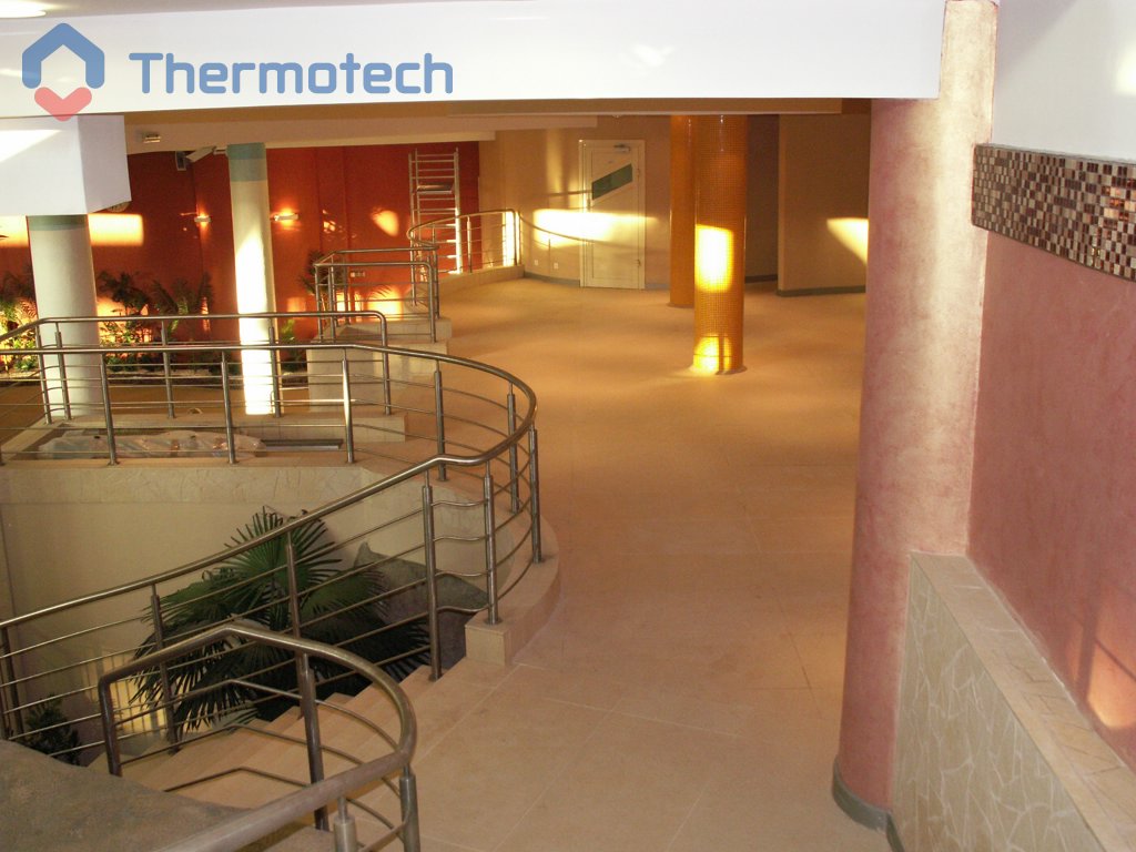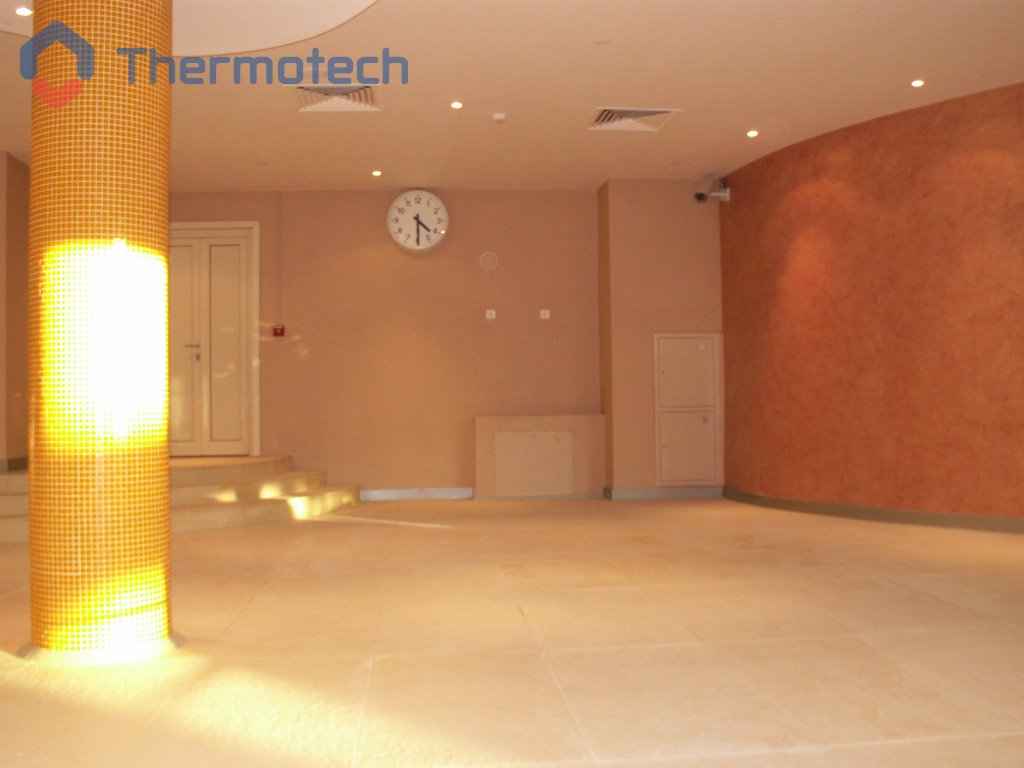 В зонах обходных дорожек и душевых система построена по принципу «комфорт» (поддержания постоянной температуры поверхности пола). Для этого в стяжку установлены датчики в пол, а на входе распределительных коллекторов – двухходовые клапана с приводами («зональное регулирование»). Из-за небольшой разности температур воздух/поверхность, а также из-за необходимости большого воздухообмена системы приточно-вытяжной вентиляции, система ВТП в этих зонах является лишь дополнительной отопительной системой, основную нагрузку же несет на себе система вентиляции.
