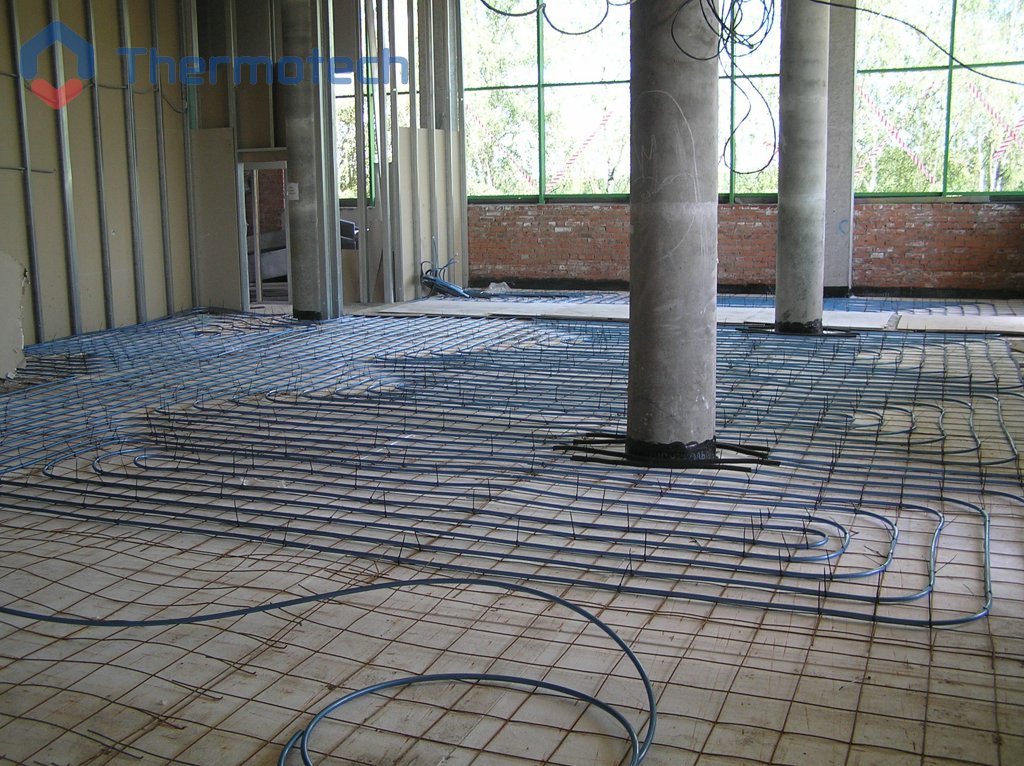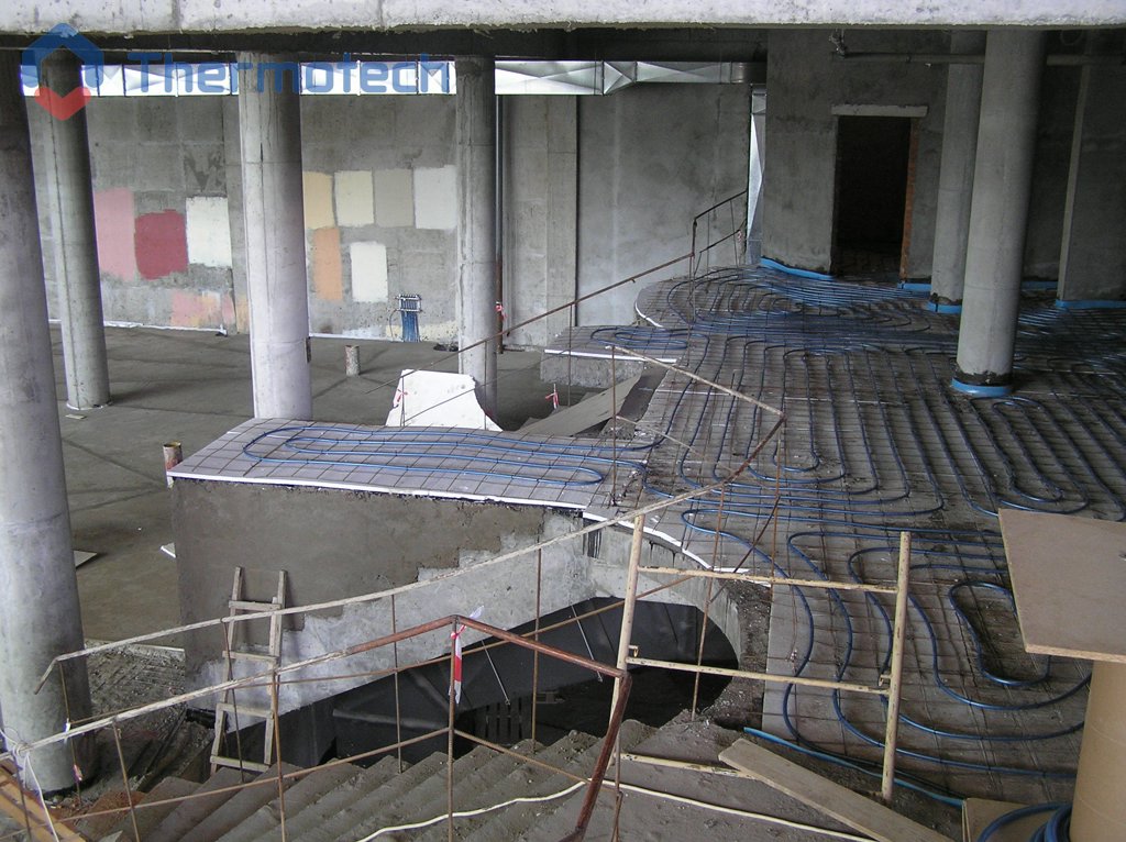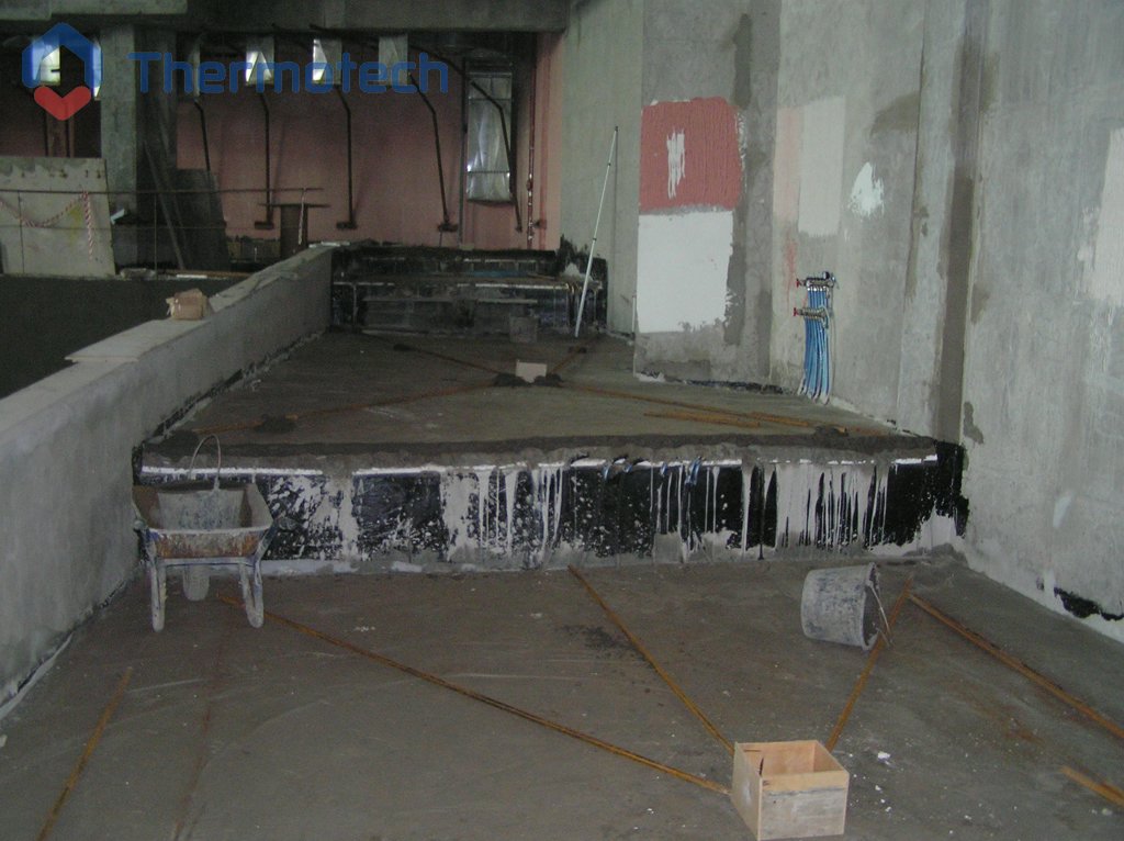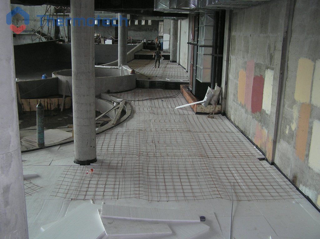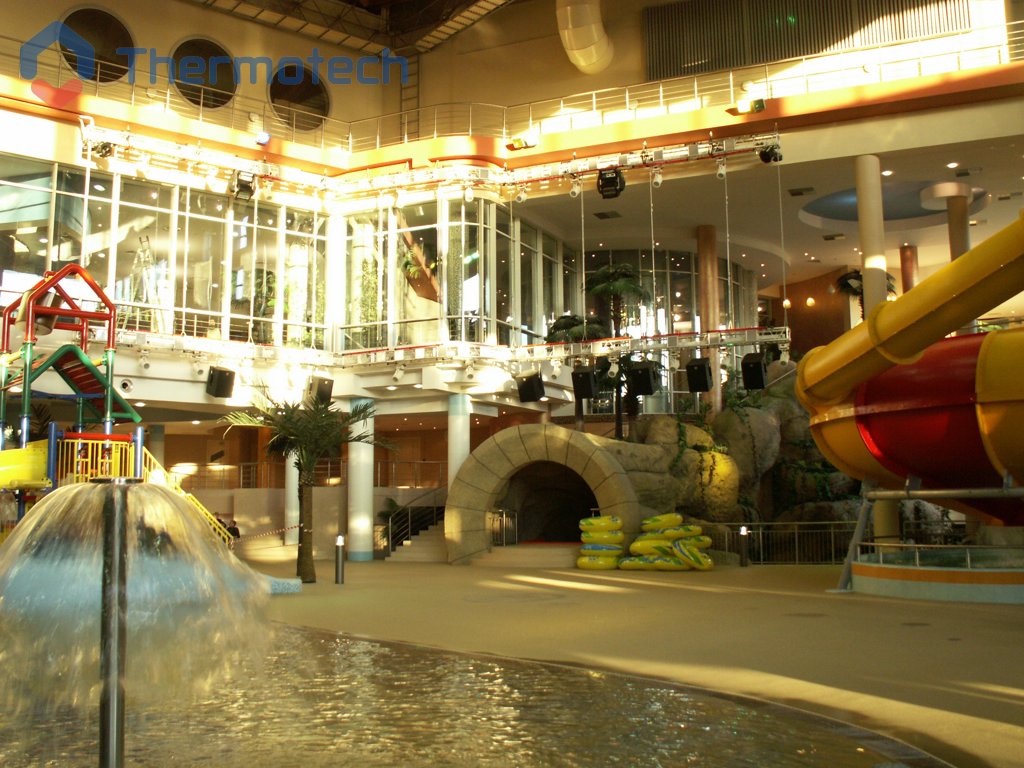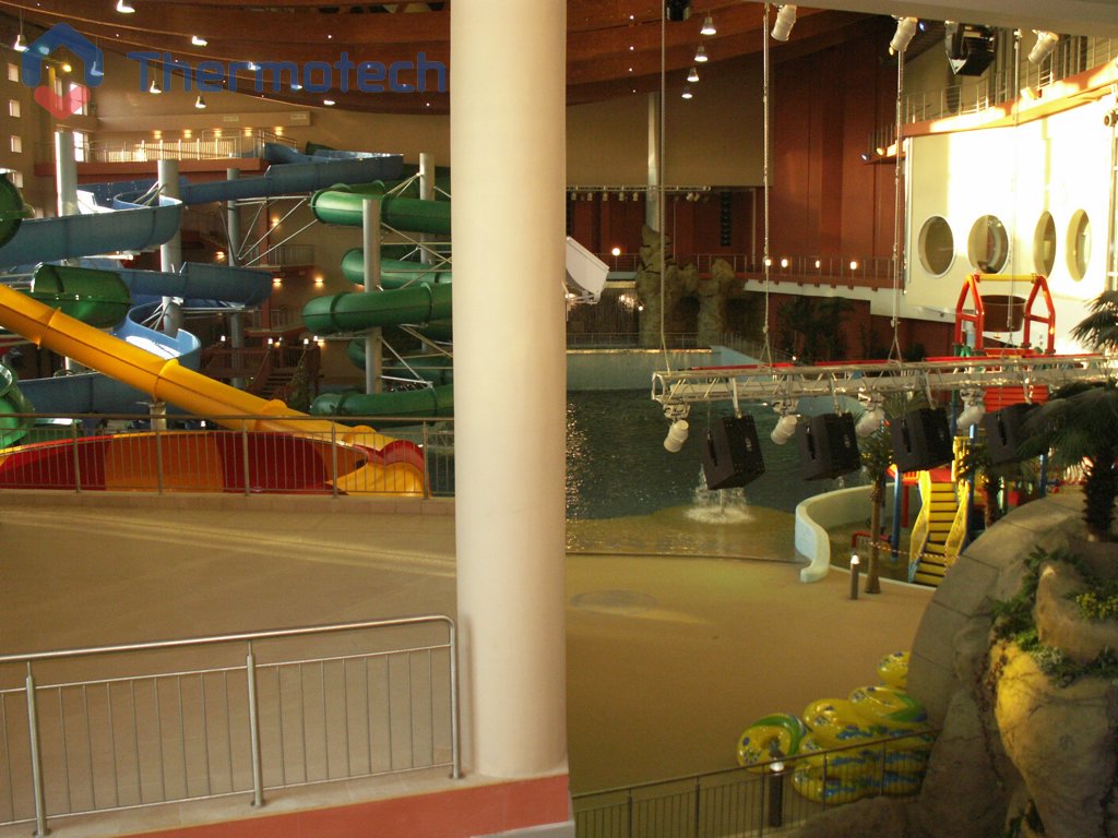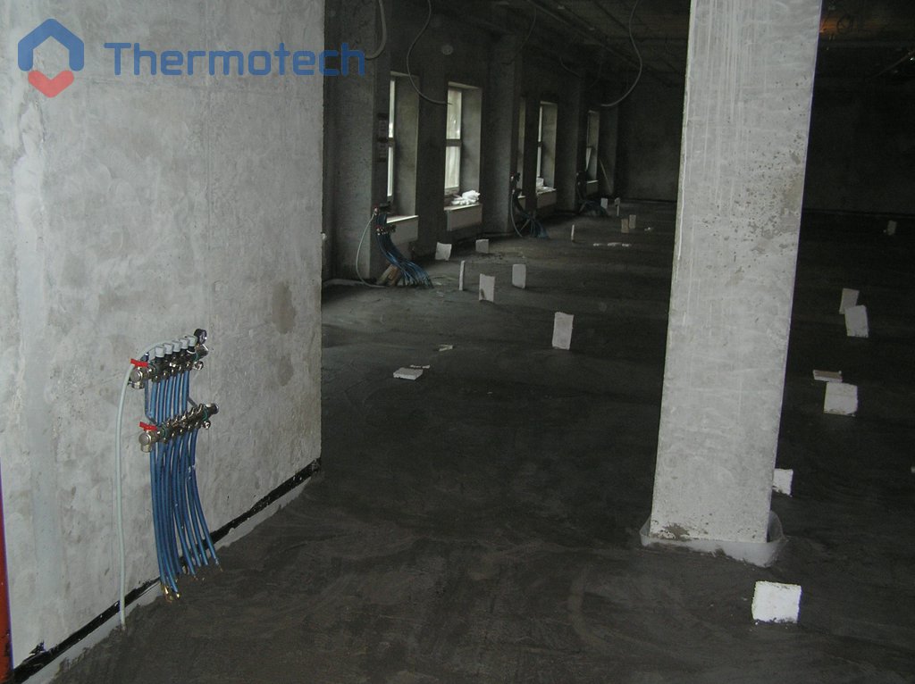 В зонах обходных дорожек и душевых система построена по принципу «комфорт» (поддержания постоянной температуры поверхности пола). Для этого в стяжку установлены датчики в пол, а на входе распределительных коллекторов – двухходовые клапана с приводами («зональное регулирование»). Из-за небольшой разности температур воздух/поверхность, а также из-за необходимости большого воздухообмена системы приточно-вытяжной вентиляции, система ВТП в этих зонах является лишь дополнительной отопительной системой, основную нагрузку же несет на себе система вентиляции.