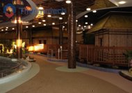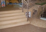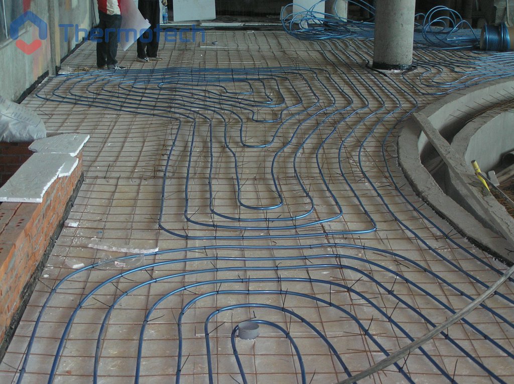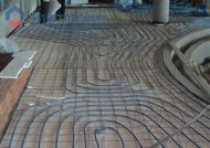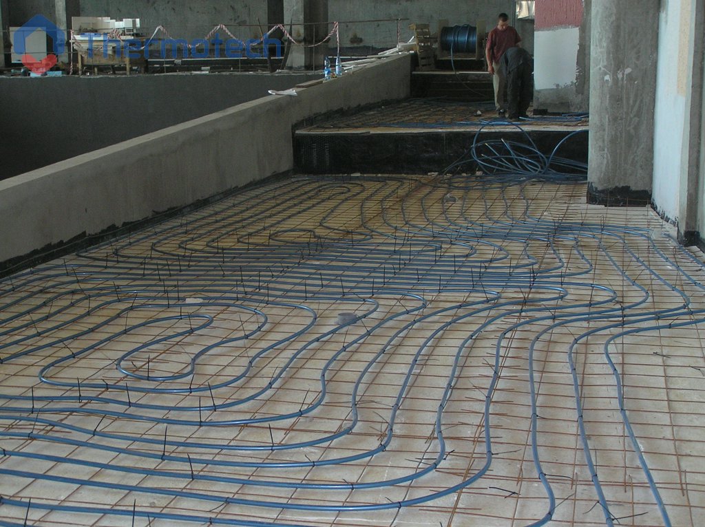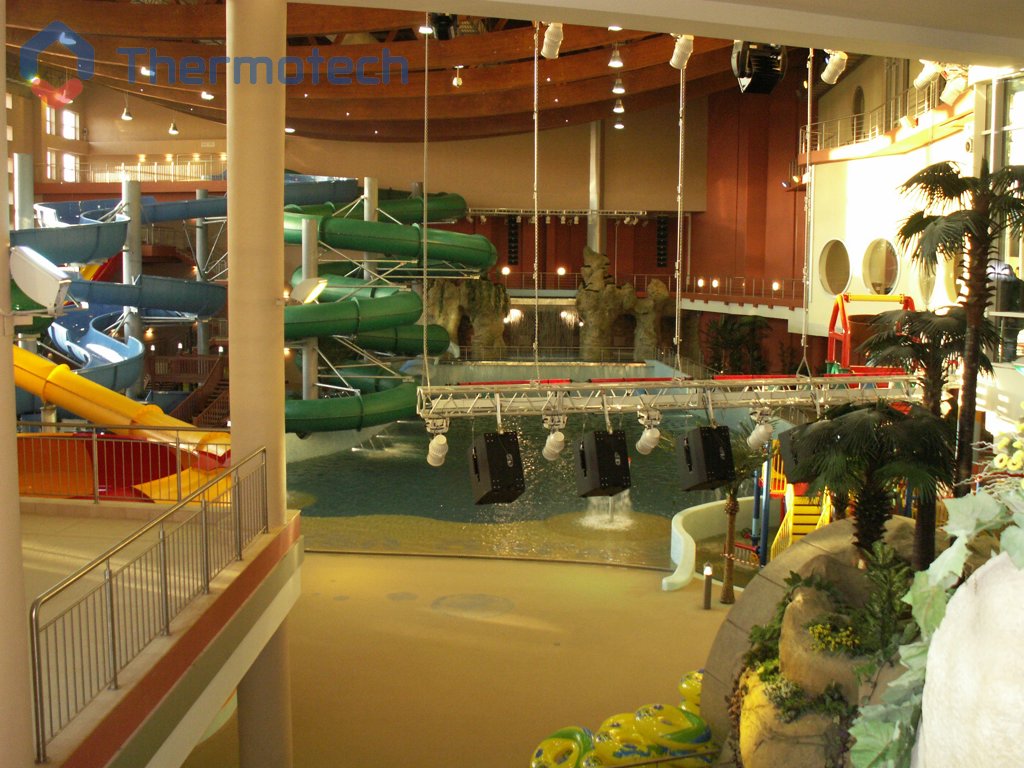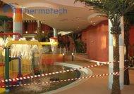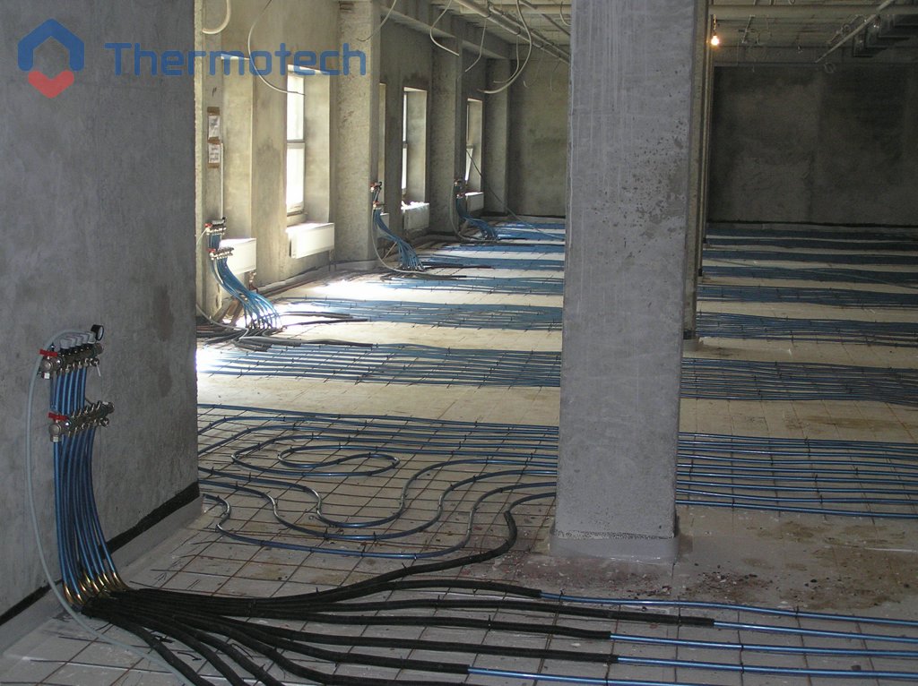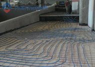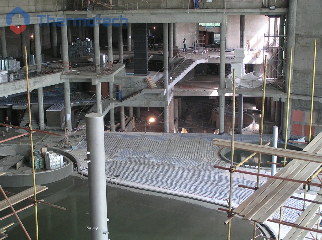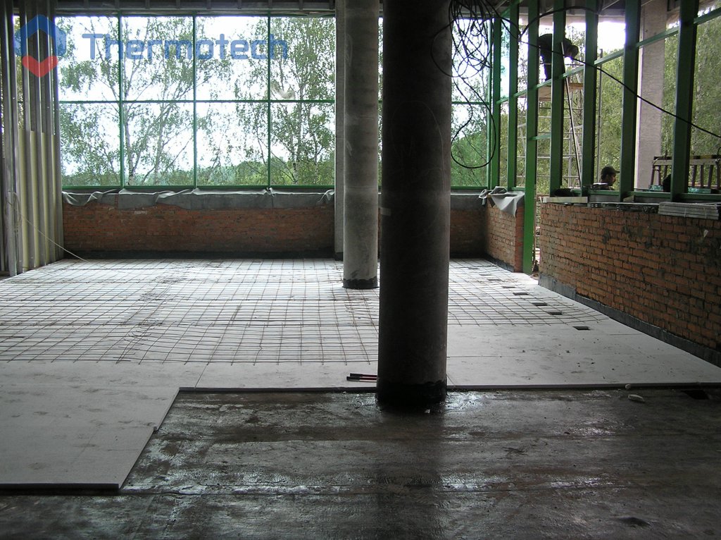 В зонах обходных дорожек и душевых система построена по принципу «комфорт» (поддержания постоянной температуры поверхности пола). Для этого в стяжку установлены датчики в пол, а на входе распределительных коллекторов – двухходовые клапана с приводами («зональное регулирование»). Из-за небольшой разности температур воздух/поверхность, а также из-за необходимости большого воздухообмена системы приточно-вытяжной вентиляции, система ВТП в этих зонах является лишь дополнительной отопительной системой, основную нагрузку же несет на себе система вентиляции.