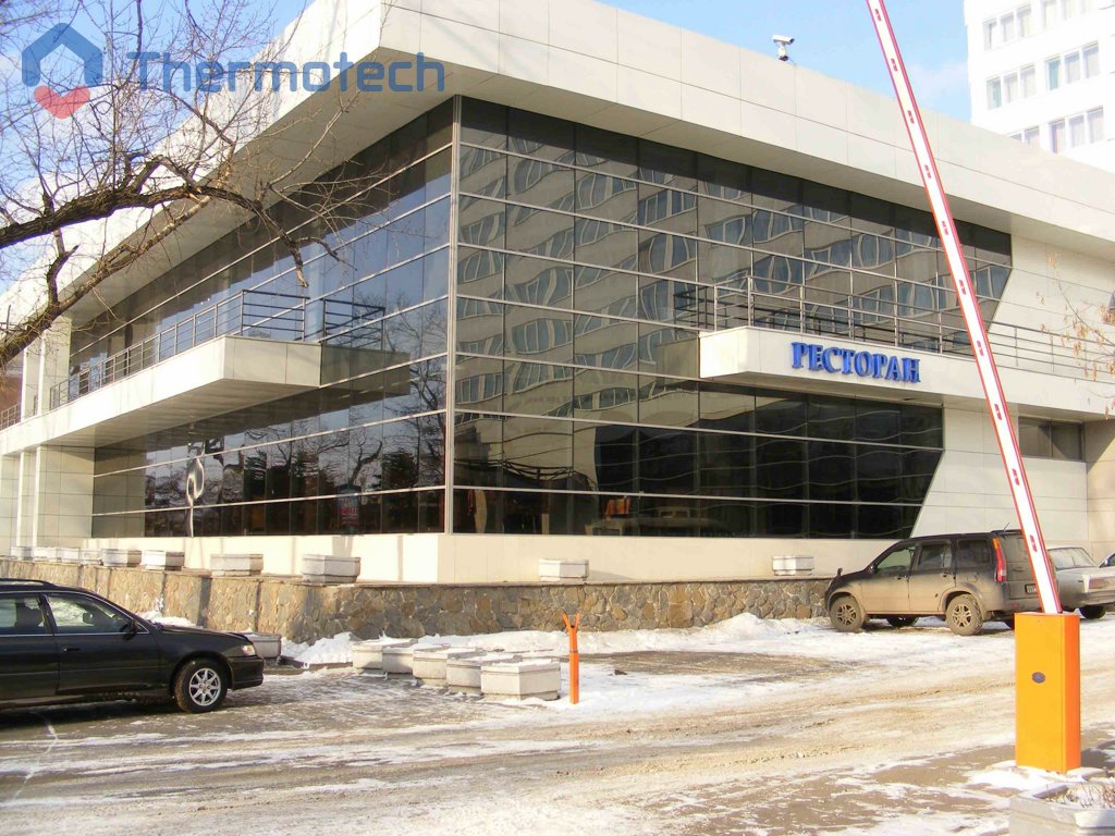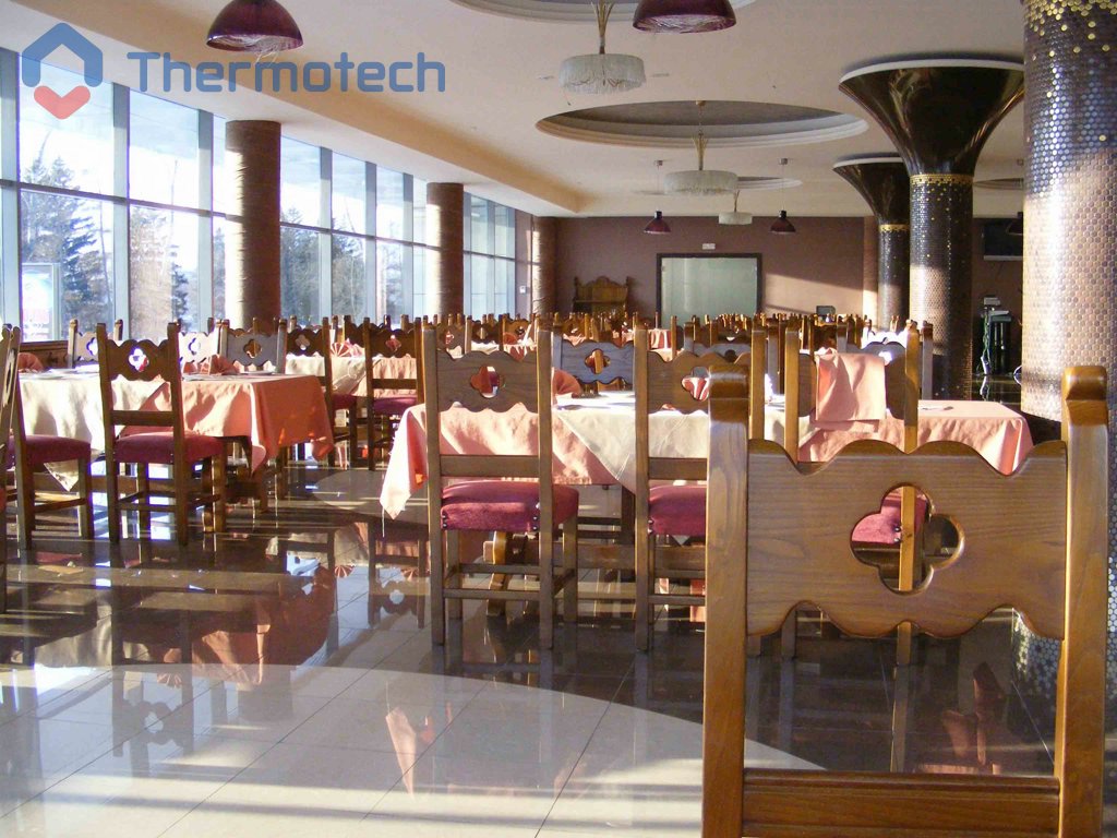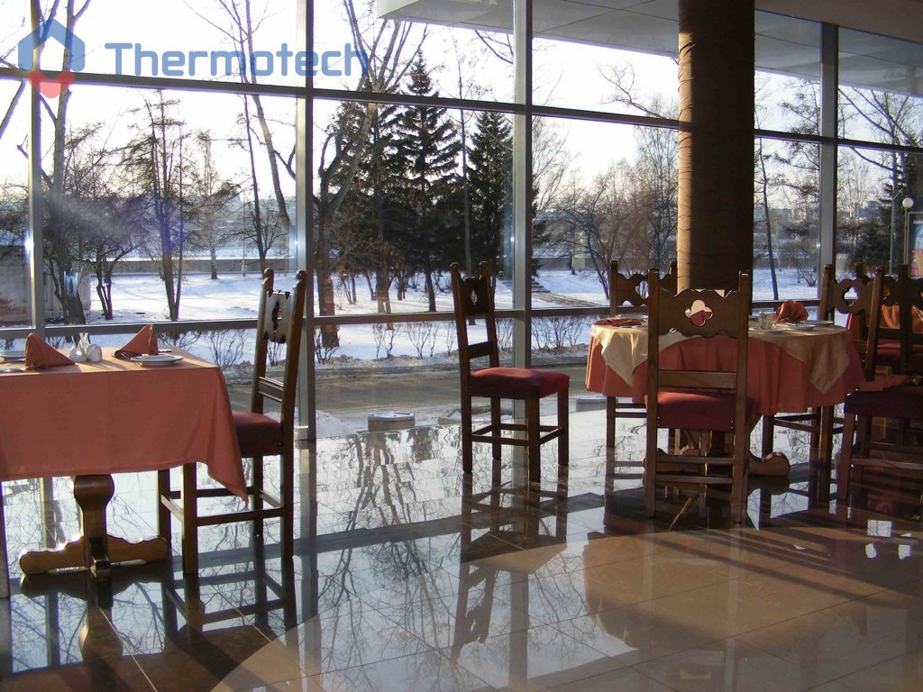 При реализации концепции ресторана перед владельцами, инвесторами и рестораторами стоял целый ряд непростых вопросов. Как максимально эффективно использовать пространство ресторана? Как сохранить эстетику помещения имеющего сплошное фасадное остекление, при этом обеспечить требуемую отопительную нагрузку? Как, исходя из планировки помещения, обеспечить свободу компоновки посадочных мест в зависимости от характера проводимого мероприятия и при этом не быть «привязанным» к расположению отопительных приборов? Как при сплошном фасадном остеклении обеспечить комфорт и уют посетителям ресторана?