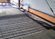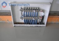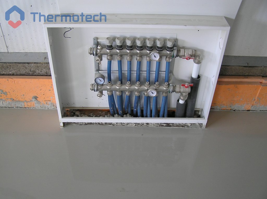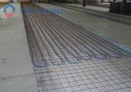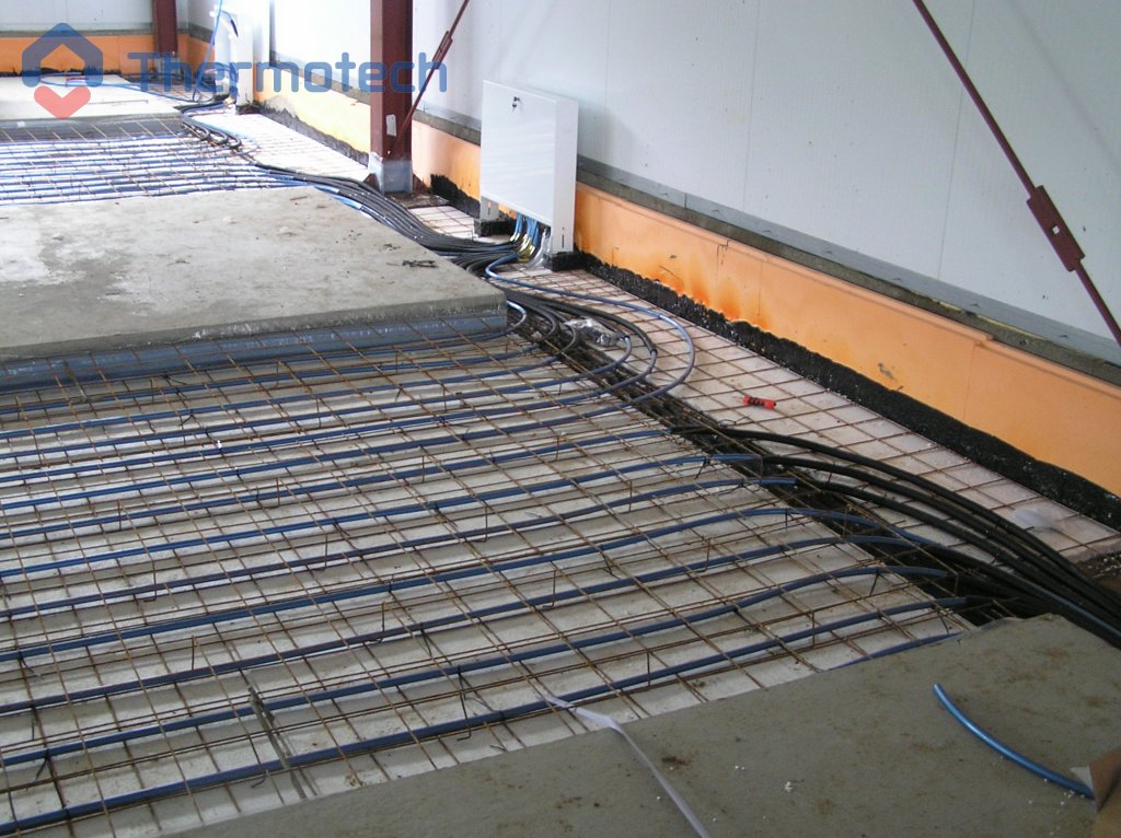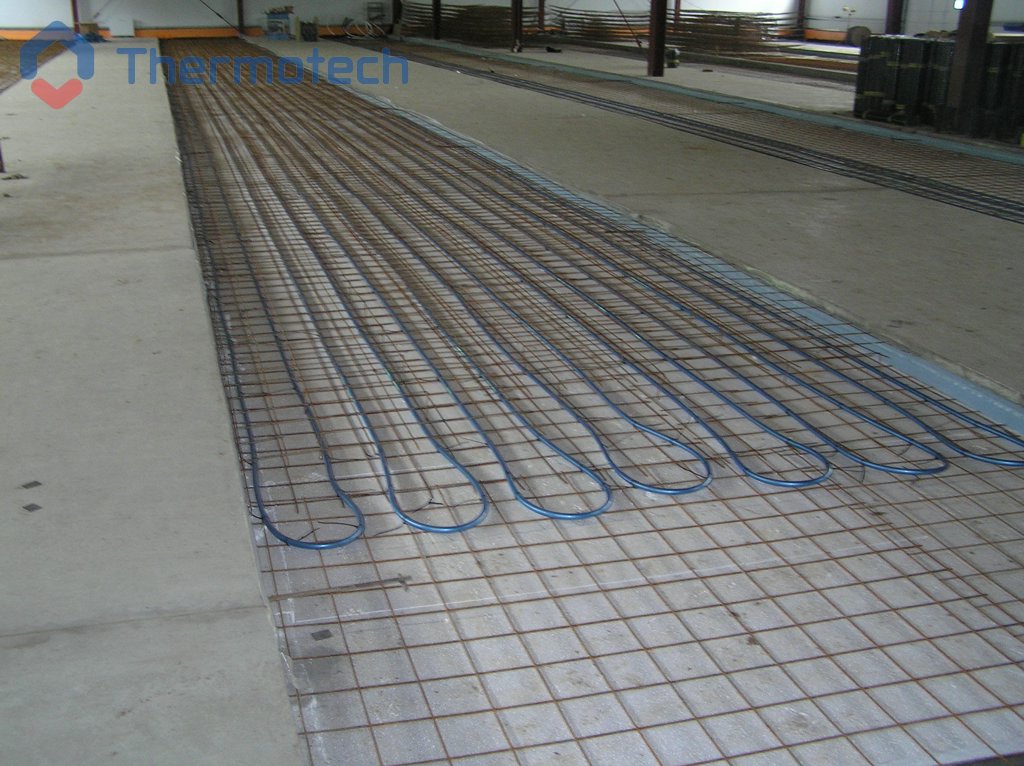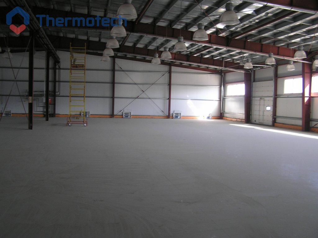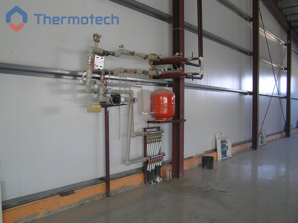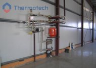 Система отопления – водяной теплый пол Термотех. Главная особенность состоит в том, что греющая панель ВТП занимает не 100% площади, а выполнена «полосами». Между подогреваемыми расположены не обогреваемые участками, необходимые для установки стеллажей и производственного оборудования.