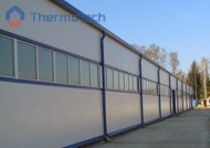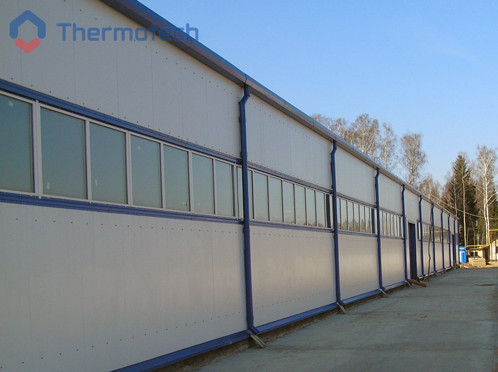 Построено по технологии быстровозводимых зданий из сэндвич-панелей. Общая площадь 3420 м2, высота 4.8 м, объем здания 16420 м3.