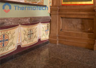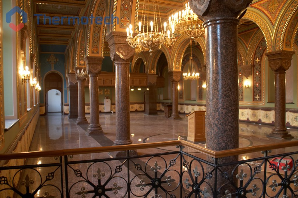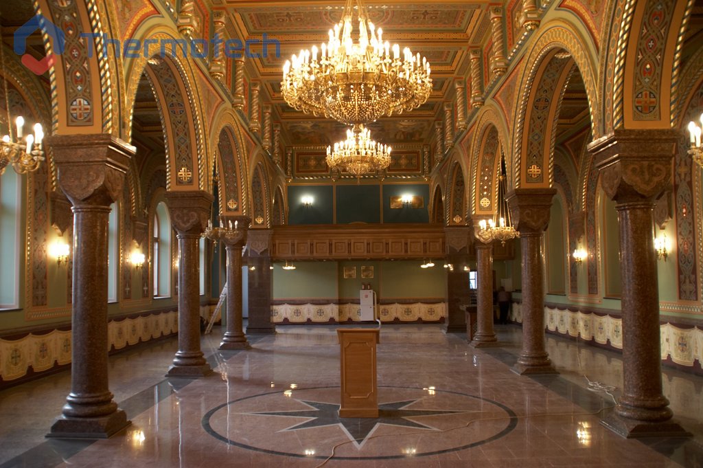 Общая отапливаемая площадь составляет 1213 м2. Основная система отопления – водяной теплый пол, смонтированный на нескольких уровнях. Источник тепла - городские тепловые сети.