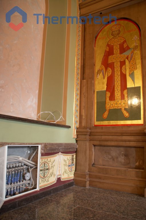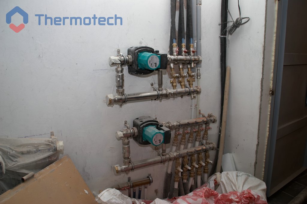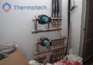 Исходя из поставленных задач, весь отопительный объем был разделен на «функциональные» зоны, установлено три магистральных смесительно-распределительных узла с индивидуальными контроллерами теплоснабжения. Распределительные коллектора водяных теплых полов спрятаны в ниши и вписаны в единый дизайн отделки помещений.