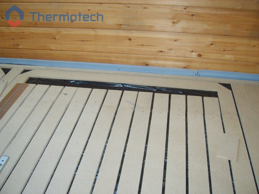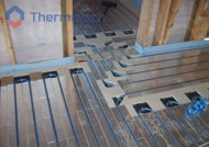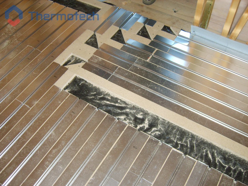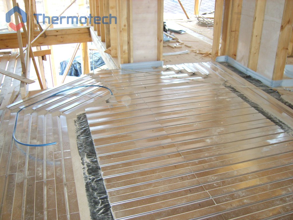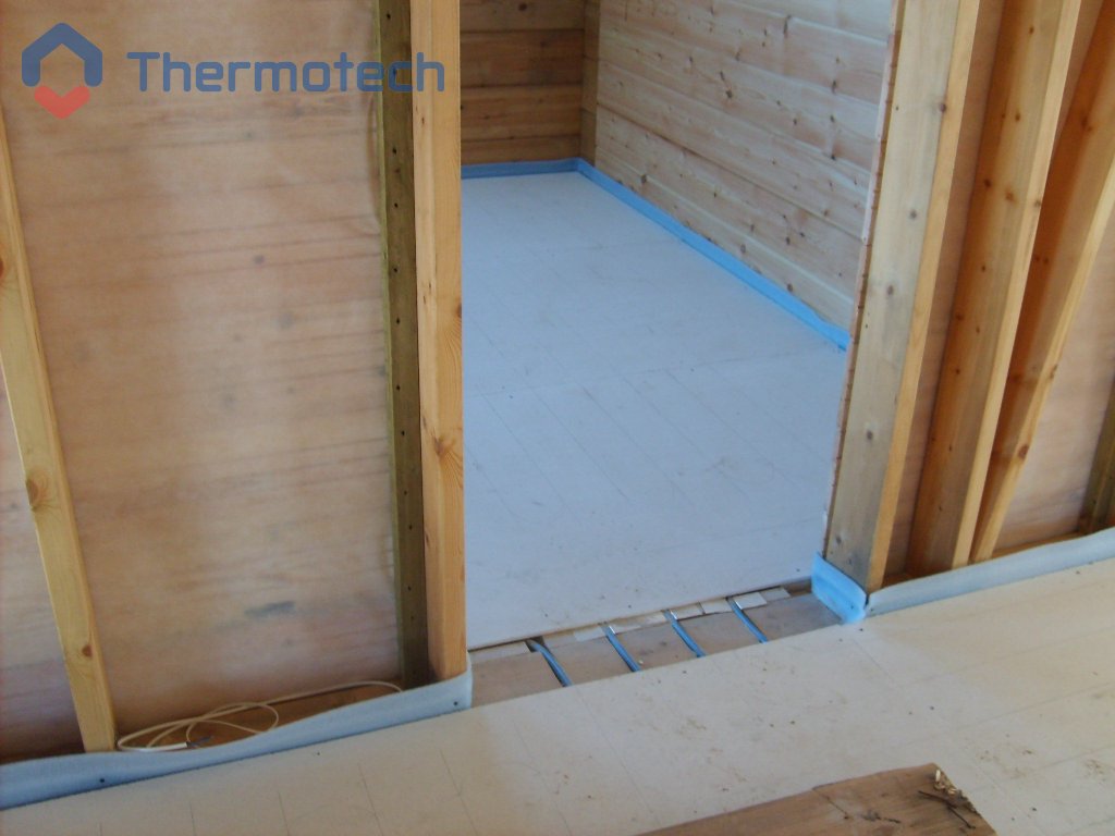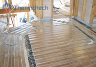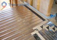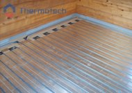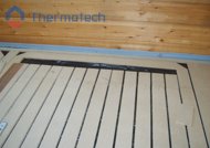 На втором этаже применена деревянная система реечного типа. Удельная нагрузка в основном доме составляет 40 Вт/м2, поэтому не было никаких проблем с применением чистового покрытия из ламината и паркета.