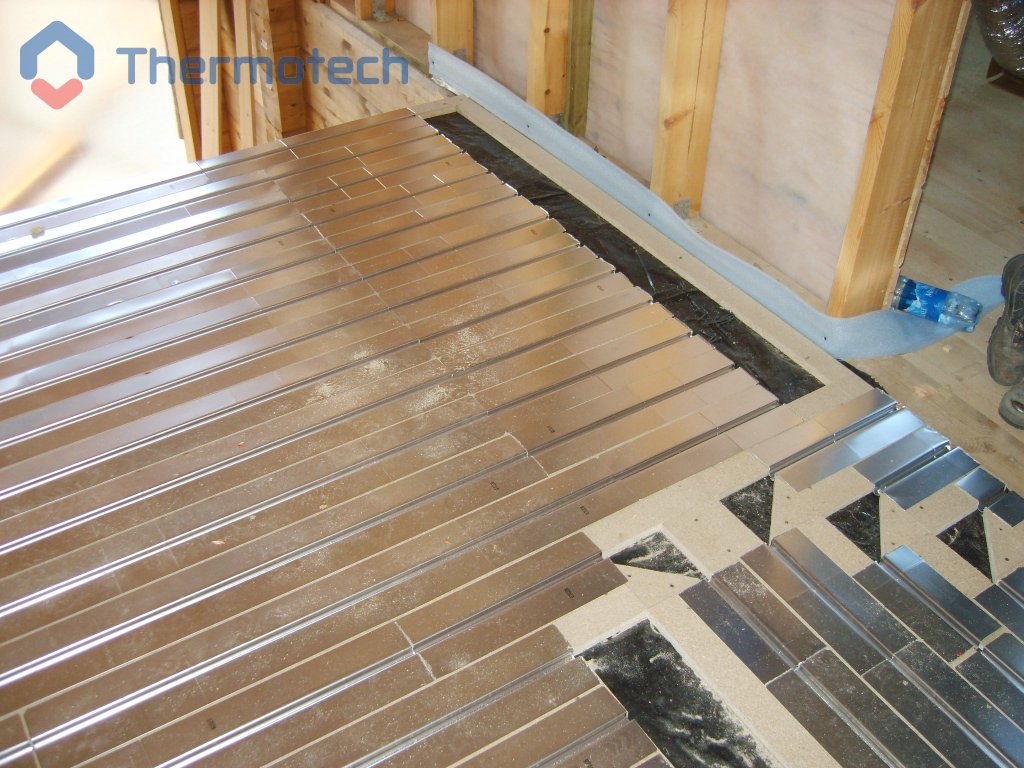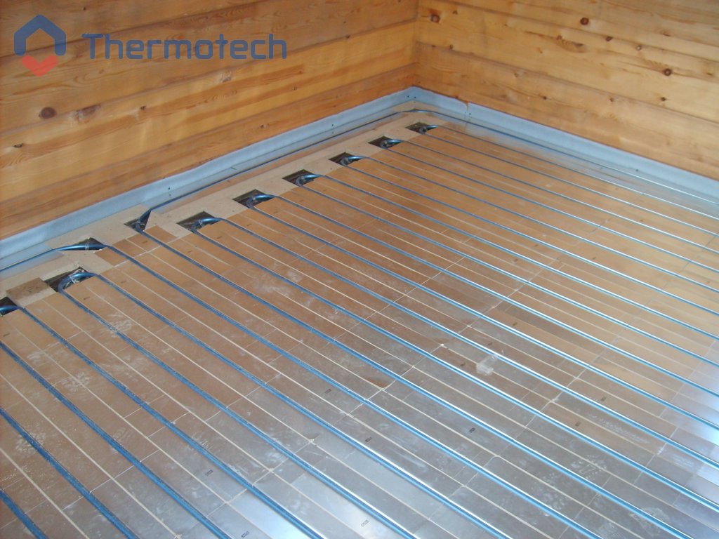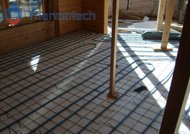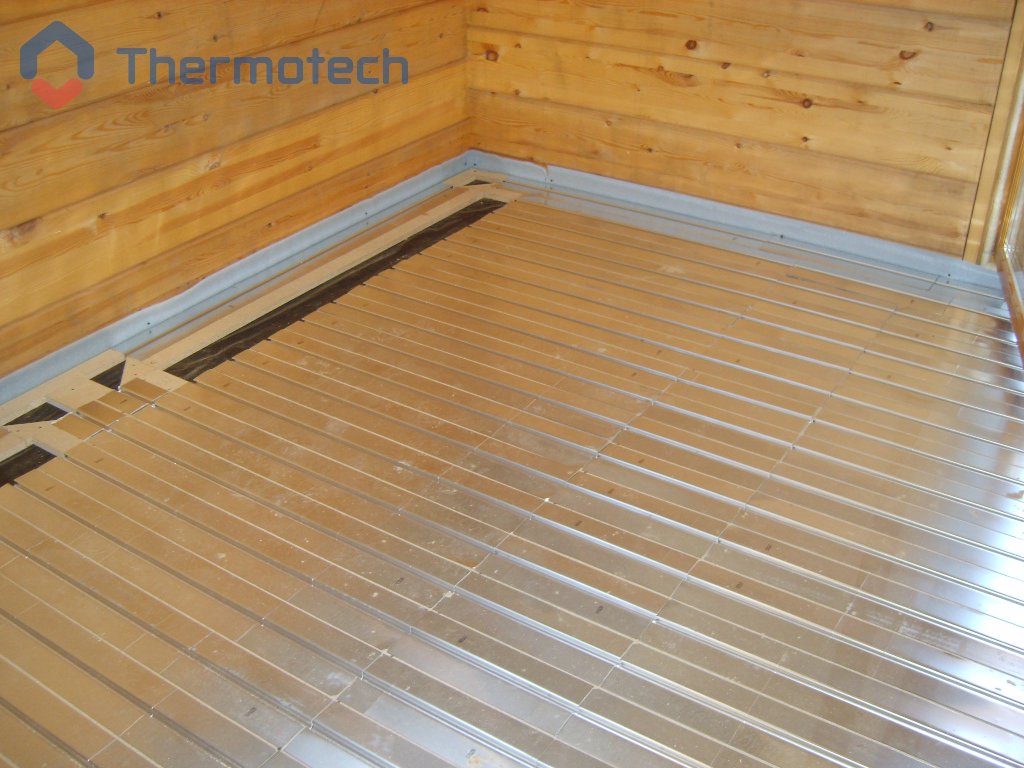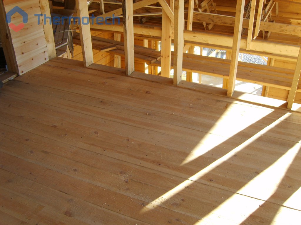 На втором этаже применена деревянная система реечного типа. Удельная нагрузка в основном доме составляет 40 Вт/м2, поэтому не было никаких проблем с применением чистового покрытия из ламината и паркета.