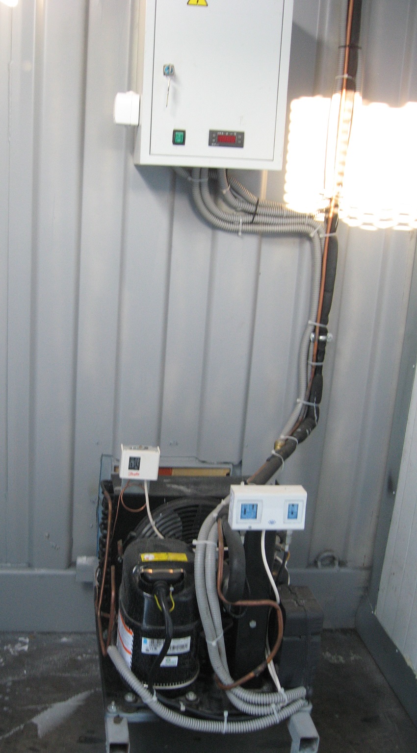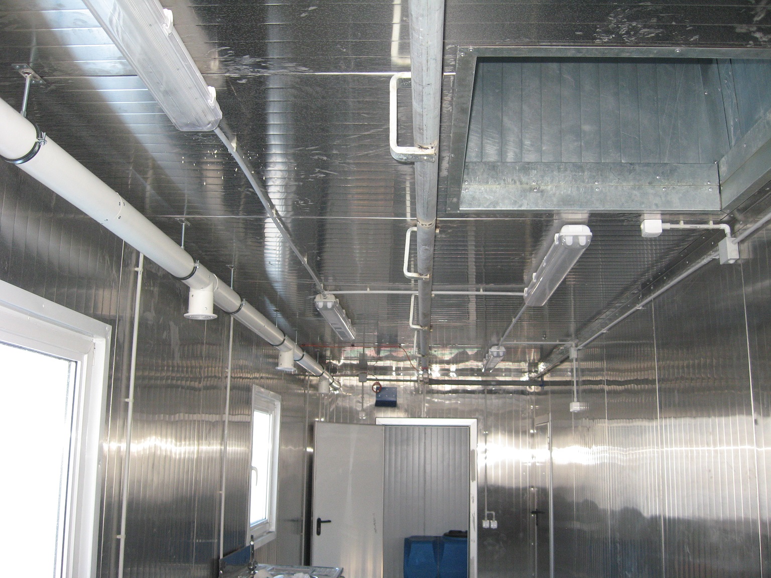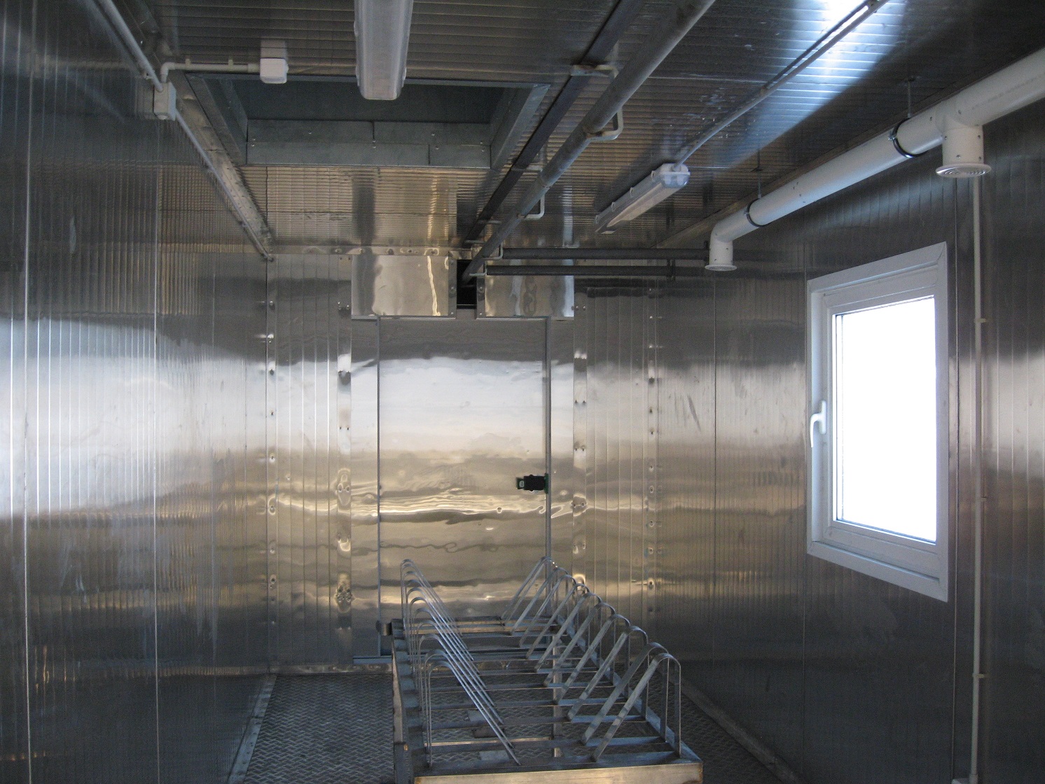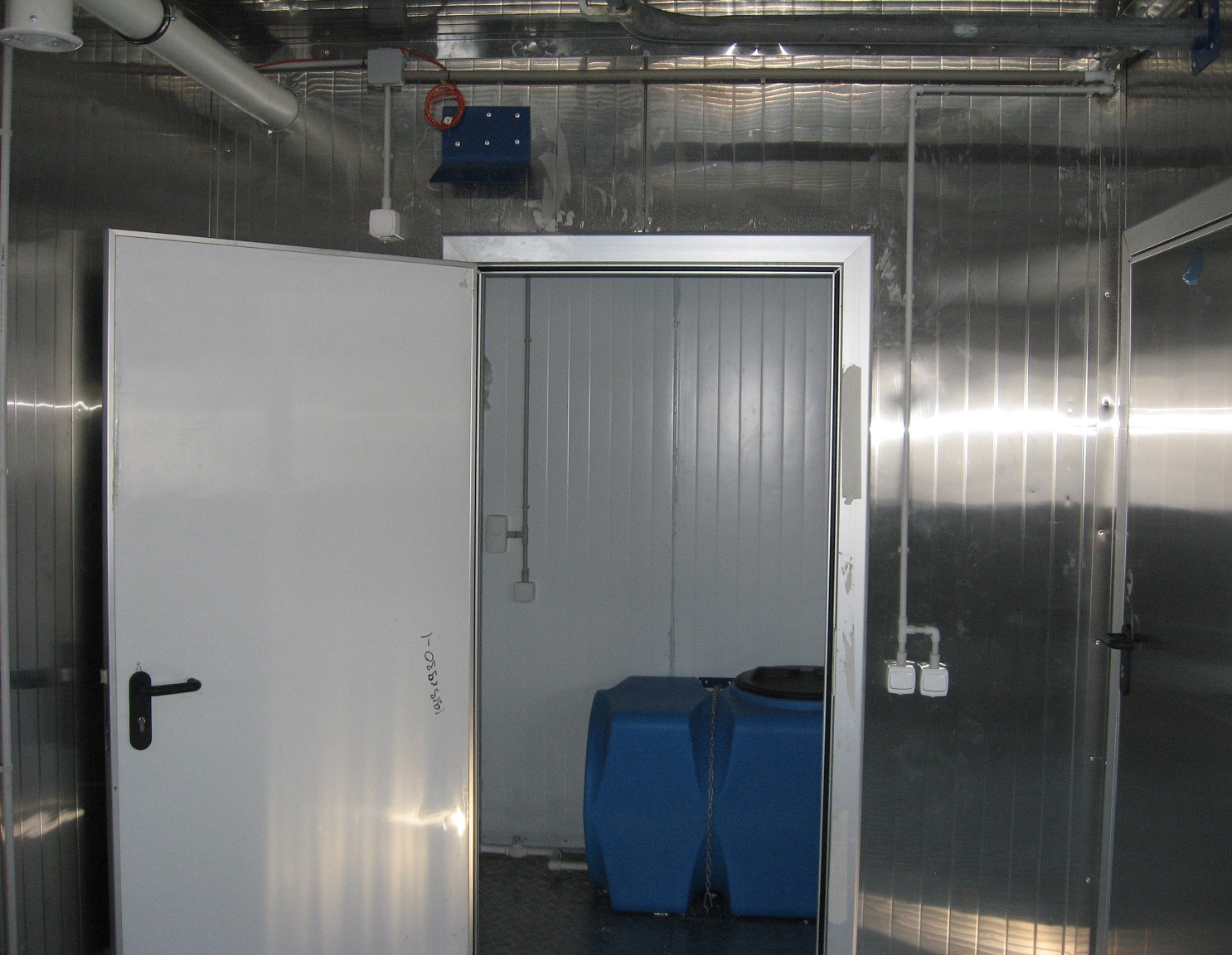Мобильный пункт из трех модулей на базе 40 - футовых контейнеров: пункт убоя, пункт первичной обвалки, мобильная морозильно –холодильная установка ММХУ40. Производительность: 40-50 голов в смену.
