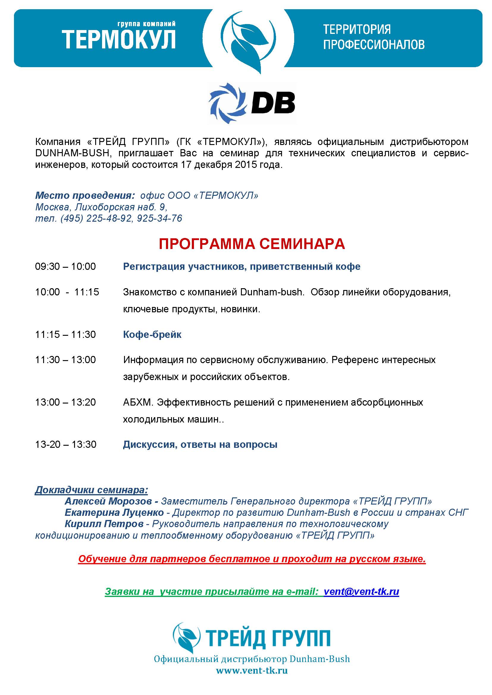 Компания «ТРЕЙД ГРУПП» (ГК «ТЕРМОКУЛ»), являясь официальным дистрибьютором DUNHAM-BUSH, приглашает Вас на семинар для технических специалистов и сервис-инженеров, который состоится 17 декабря 2015 года.