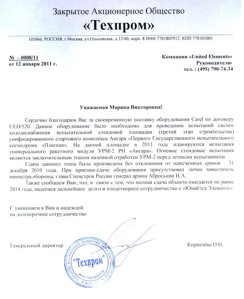 United Elements благодарит компания Техпром за своевременную поставку оборудования Carel (менеджер по продажам Юрий Лещенко) для Первого государственного космодрома «Плесецк».