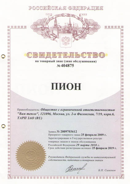 Свидетельство на товарный знак ПИОНКомпанией «Вам тепло» получено свидетельство на товарный знак ПИОН.
