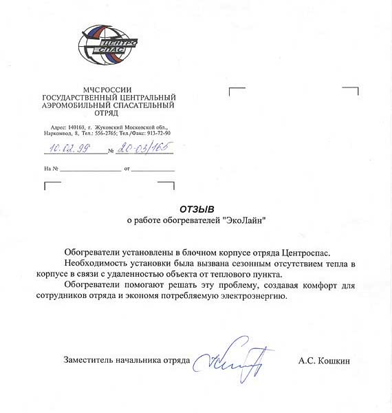 Обогреватели установлены в блочном корпусе Государственного центрального аэромобильного спасательного отряда МЧС России в г. Жуковском Московской обл., Наркомвод, 8.