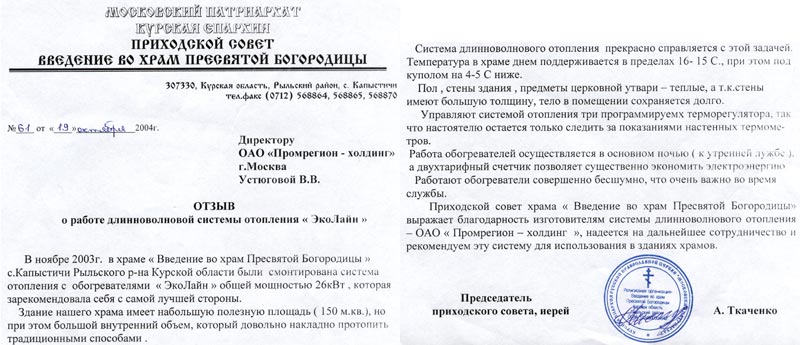 Приходской совет храма «Введение во храм Пресвятой Богородицы» выражает благодарность изготовителям системы длинноволнового отопления — ОАО «Промрегион — холдинг», надеется на дальнейшее сотрудничество и рекомендует эту систему для использования в зданиях храмов.