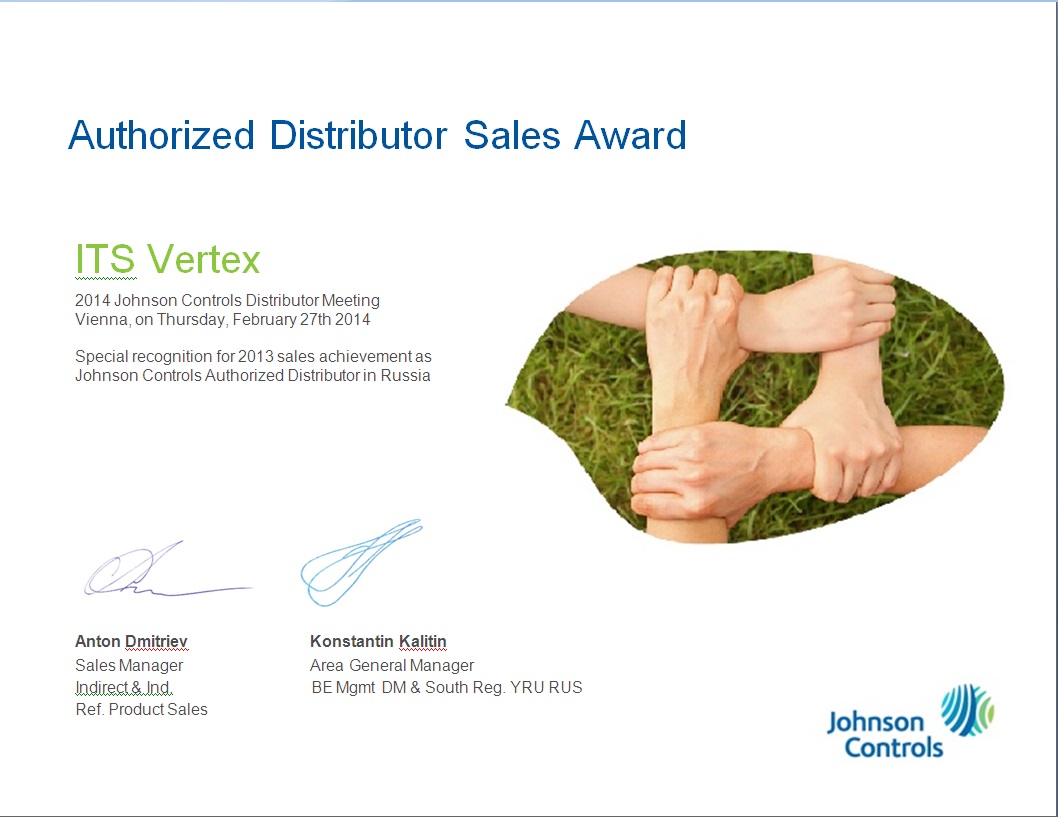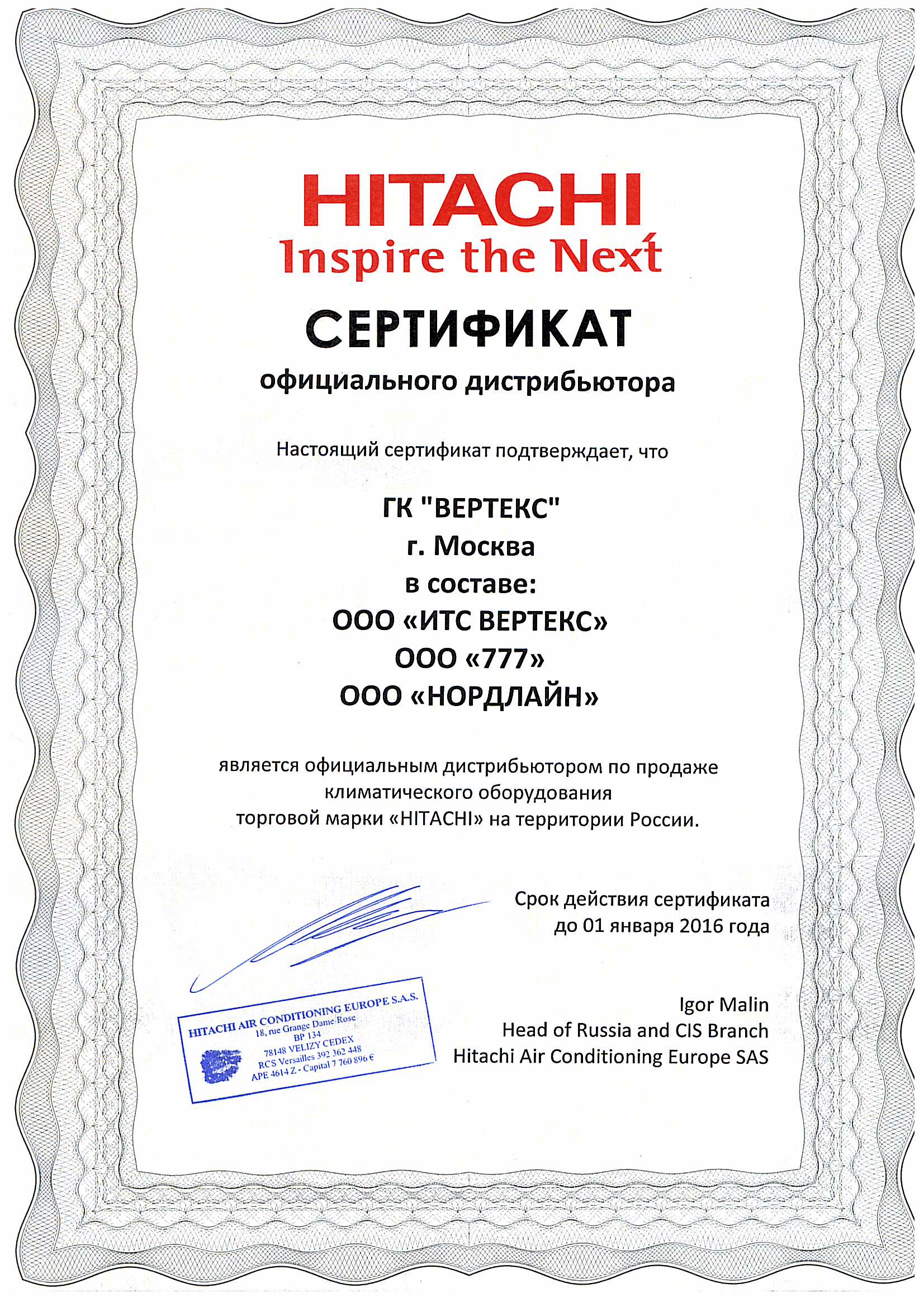 Сертификат официального дистрибьютора Hitachi на 2015 год