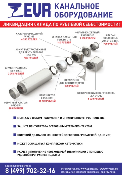 Канальное оборудование EVR. Ликвидация склада по рублевой себестоимости