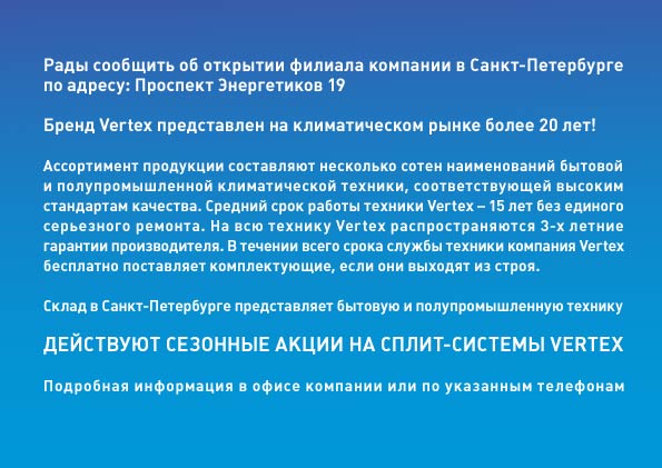 Новое подразделение компании ВЕРТЕКС по бытовому и полупромышленному оборудованию в Санкт-Петербурге.