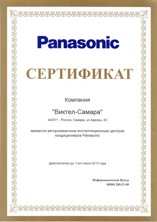 Сертификат авторизованного инсталляционного центра кондиционеров Panasonic