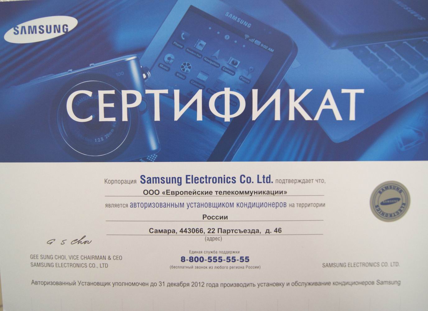 Сертификат авторизованного установщика кондиционеров Samsung на территории России