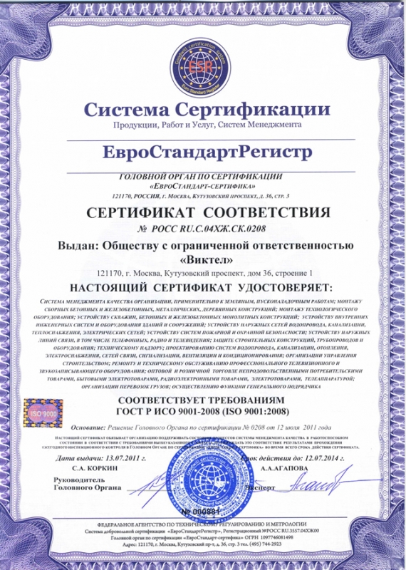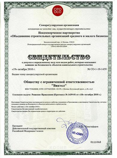 Свидетельство о членстве Компании Виктел в некоммерческом партнерстве по содействию в строительстве «Профессионалы Строительного Комплекса», имеющем статус СРО