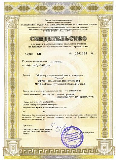 Свидетельство о допуске к работам по проектированию внутренних и наружных сетей инженерно-технического комплекса, а так же проектированию мероприятий по обеспечению пожарной безопасности