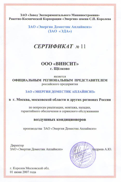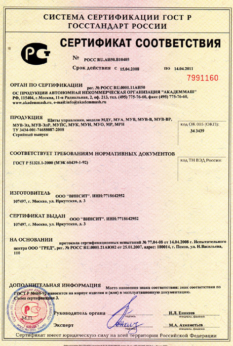 Сертификат соответствия Госстандарта России на щиты управления Винсит