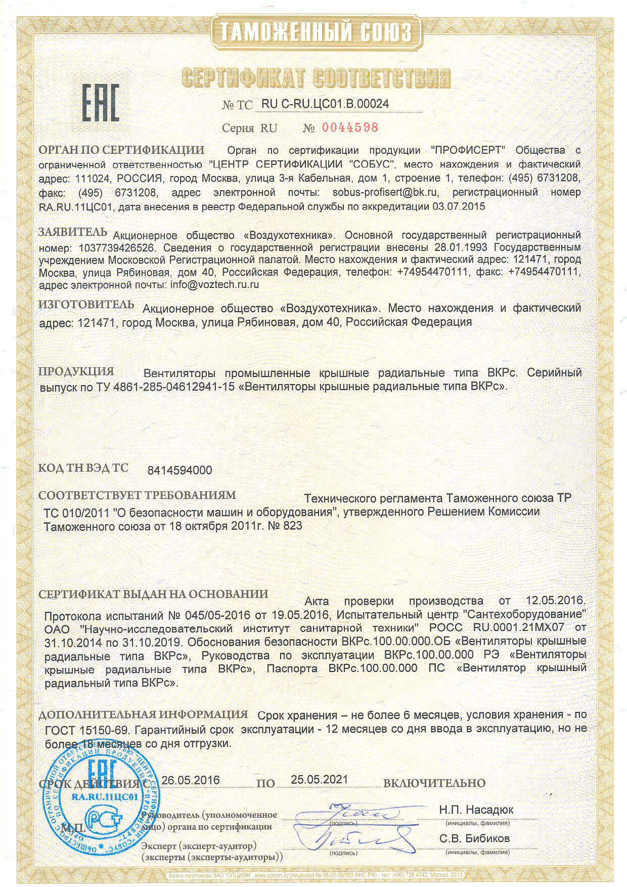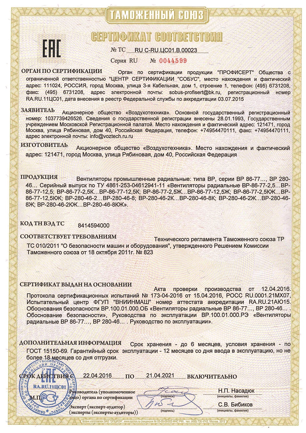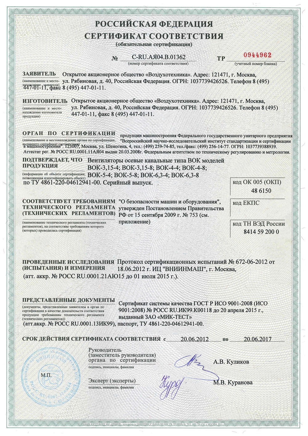 Лицензии и сертификаты компании Воздухотехника, ТД