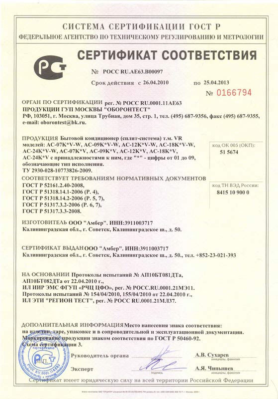 Сертификат соответствия на продукцию VR
