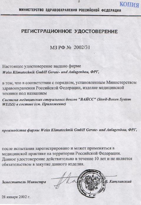 - Регистрационное удостоверение на систему медицинских стерильных боксов «ВАЙСС»
