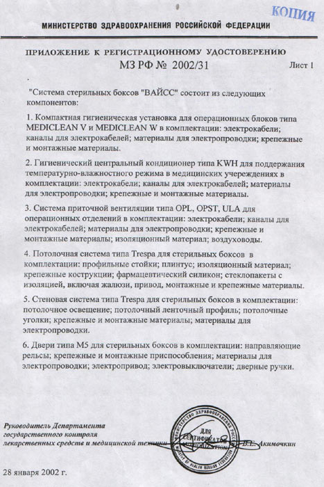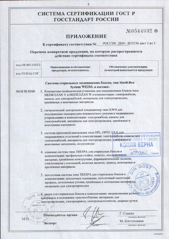 - Сертификат соответствия на систему медицинских стерильных боксов «ВАЙСС», прил.1