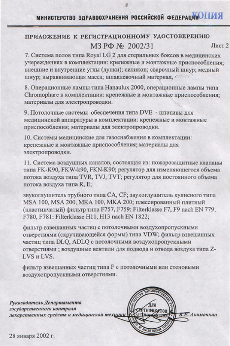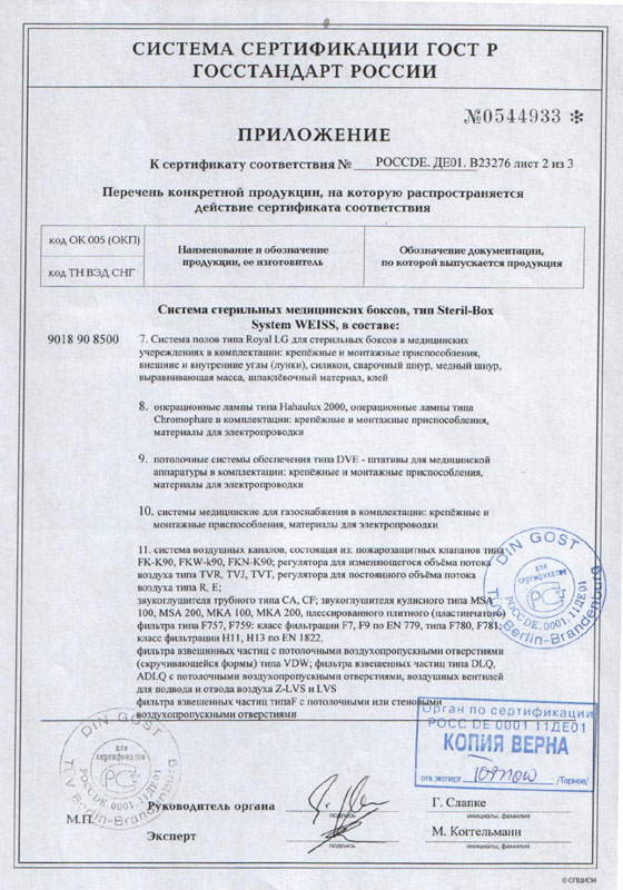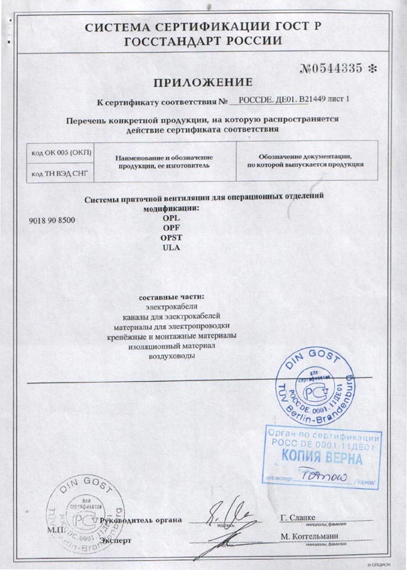 - Сертификат соответствия на системы приточной вентиляции для операционных отделений, прил.