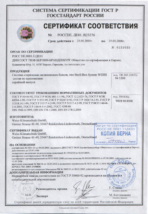 - Сертификат соответствия на систему медицинских стерильных боксов «ВАЙСС»