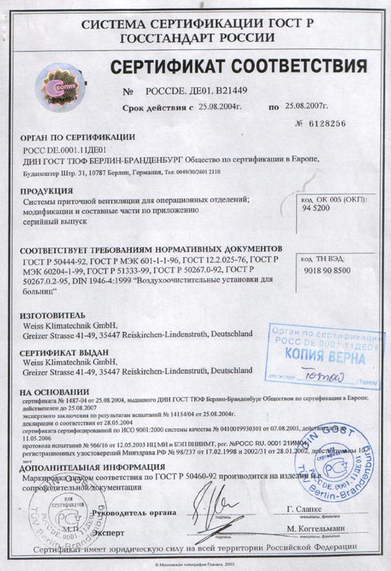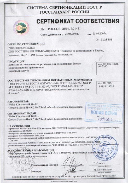 - Сертификат соответствия на системы приточной вентиляции для операционных отделений